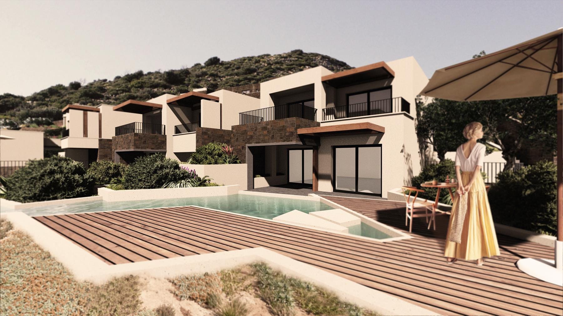 Τα δωμάτια διακρίνονται σε δύο ζώνες, στην υπάρχουσα, που βρίσκεται στο κεντρικό χαμηλότερο επίπεδο του καταλύματος, και τη νέα, που θα δημιουργηθεί στο υψηλότερο επίπεδο και θα περιλαμβάνει πιο ιδιαίτερους τύπους διαμονής. Στην υπάρχουσα δόμηση θα συμπεριληφθούν οι βασικοί τύποι, δηλαδή τα Deluxe και Premium δωμάτια με ανέσεις όπως αναβαθμισμένο mini bar, μικρή κάβα και συντηρητή κρασιών, χώρο εργασίας και ιδιωτικό μπαλκόνι, βεράντα ακόμα και κήπο, αλλά και πιο ευρύχωρα δωμάτια όπως τα Penthouse Rooms με ιδιωτική πισίνα με ξαπλώστρες και ομπρέλα, εσωτερικό ή εξωτερικό χώρο φαγητού και διακριτό καθιστικό. Στη ζώνη αυτή τοποθετούνται επίσης και πιο ευρύχωρες Σουίτες, ενός και δύο υπνοδωματίων, με ιδιωτική πισίνα και πανοραμική θέα στη θάλασσα, ενώ οι πιο ιδιαίτερες Maisonette-style σουίτες εκτείνονται σε τρία επίπεδα, με ιδιωτικό κήπο με plunge pool στο ισόγειο και θέα στη θάλασσα από τον πάνω όροφο.